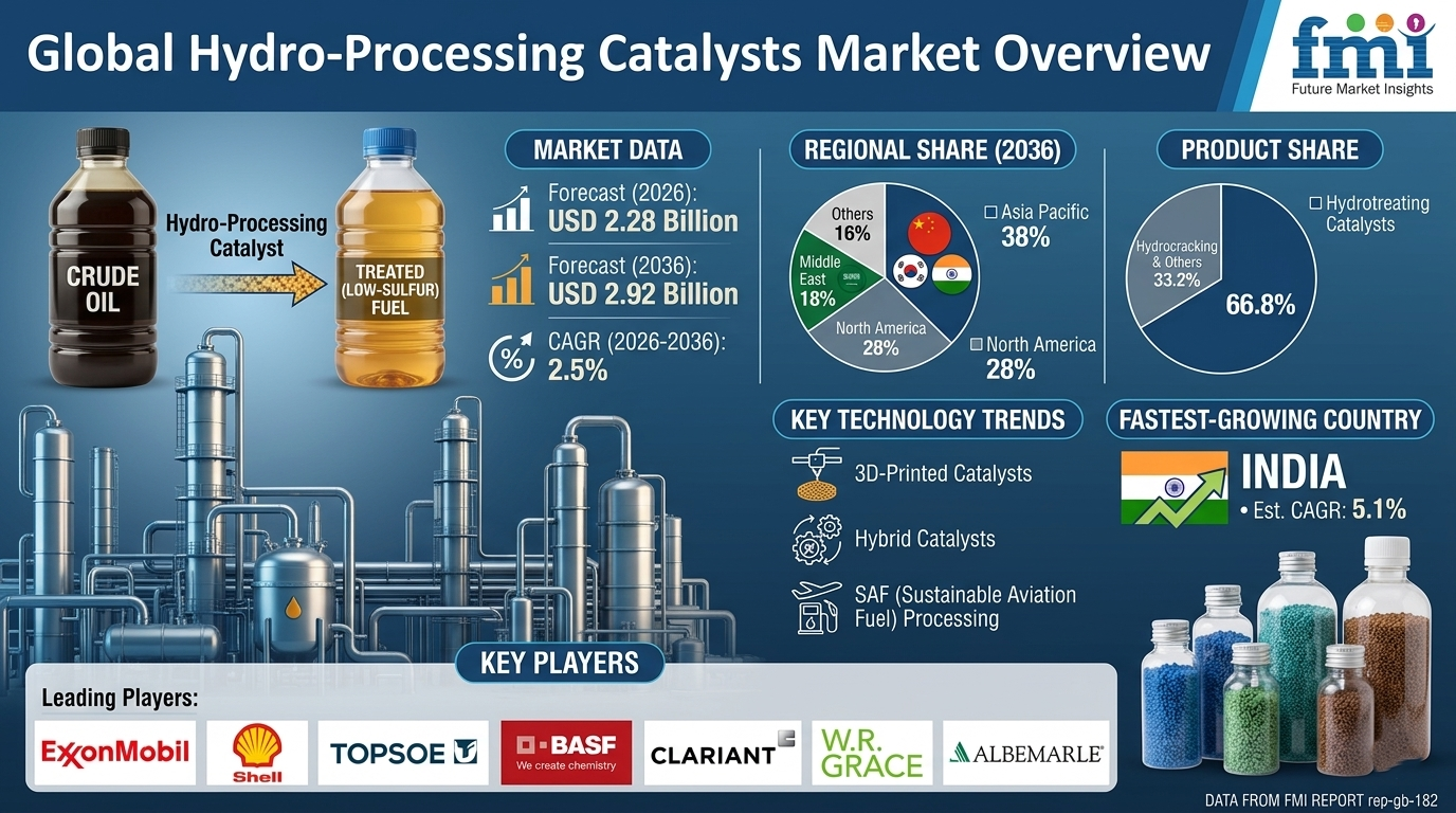 The global hydro-processing catalysts market is poised for steady expansion, rising from USD 2.28 billion in 2026 to USD 2.92 billion by 2036 at a CAGR of 2.5%. Growth is supported by tightening global fuel quality standards and sustained refining throughput levels. Increasing demand for sustainable aviation fuel (SAF) and renewable diesel is further strengthening catalyst demand across refining and biofuel applications.