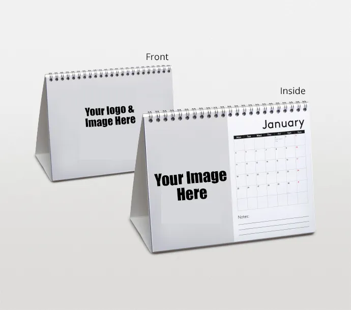 A desktop calendar is a small, freestanding calendar designed to sit on a desk or workspace. It typically displays monthly or weekly dates and often includes custom branding, images, or messages.