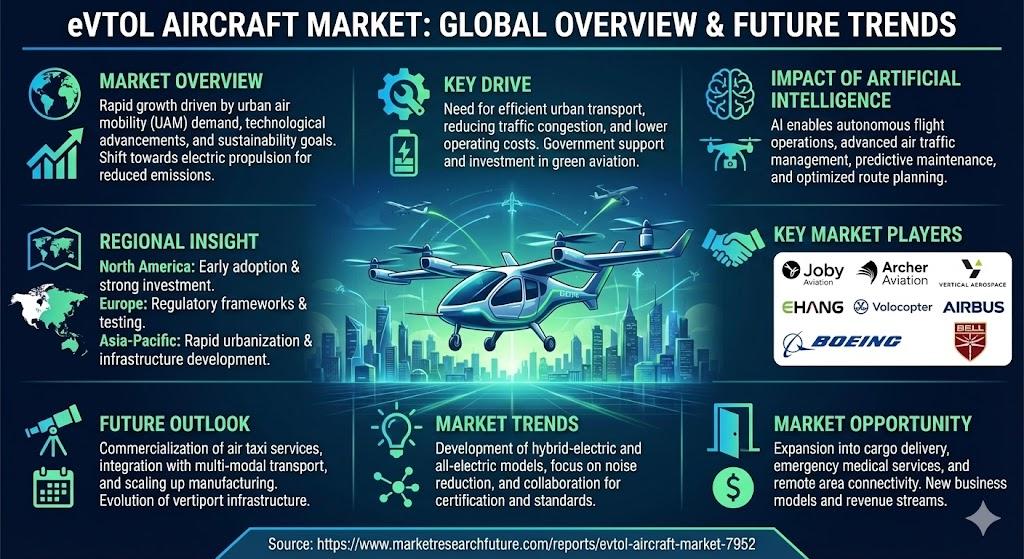 The future scope of the eVTOL Aircraft Market includes widespread adoption across passenger transport, emergency medical services, and urban logistics. As battery technology evolves, aircraft endurance and efficiency are expected to improve significantly. The development of standardized air traffic management systems for low-altitude operations will further support market expansion.