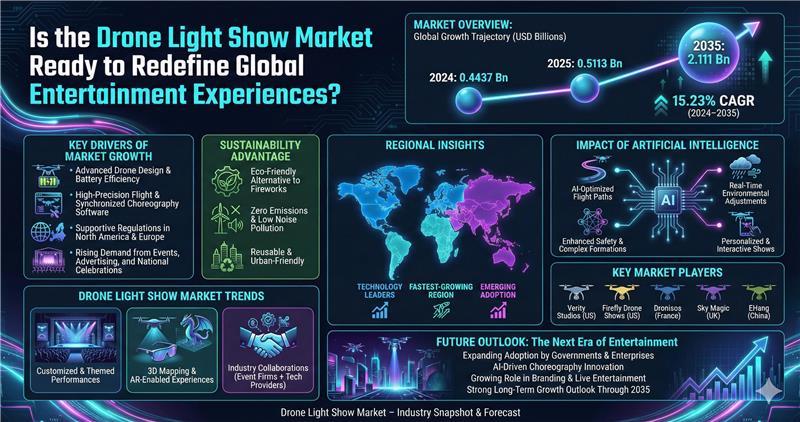 The Drone Light Show Market is transforming global entertainment through synchronized aerial visuals that replace traditional fireworks with programmable drone formations. Growing adoption across national celebrations, brand activations, and public festivals is reshaping how audiences experience large-scale visual storytelling.